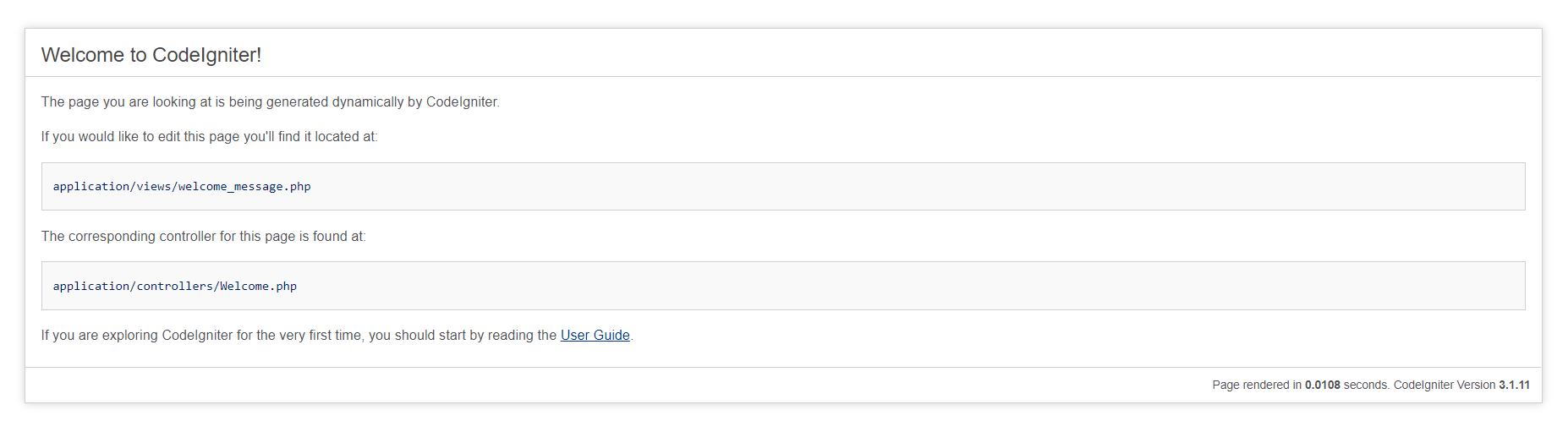 mesajını veriyor. Alt kısımda User Guide kısmı da bizi dökümana yönlendiriyor. Şu an basarsak çalışmaz çünkü biz projemizi kurarken application, system, index.php yi aldık sadece ama user_guide klasörünü almadık. Alsaydık çalışırdı :).