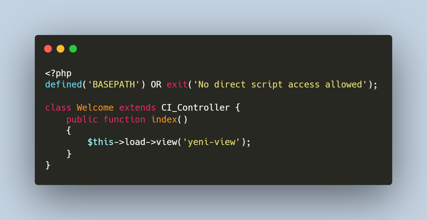 şeklinde kodlarımızı görebiliriz. Burası da codeigniter geliştiricileri tarafından hazır olarak yazılmıştır. Kod kısmında da gördüğünüz üzere bizim sayfamıza bir view dahil etmemiz gerektiği durumlarda yani kullanıcının karşısına bir view göstereceğimiz zaman kullanacağımız komut