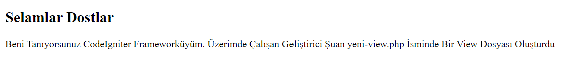 <p>Beni Tanıyorsunuz CodeIgniter Frameworküyüm. Üzerimde Çalışan Geliştirici Şuan yeni-view.php İsminde Bir View Dosyası Oluşturdu</p>