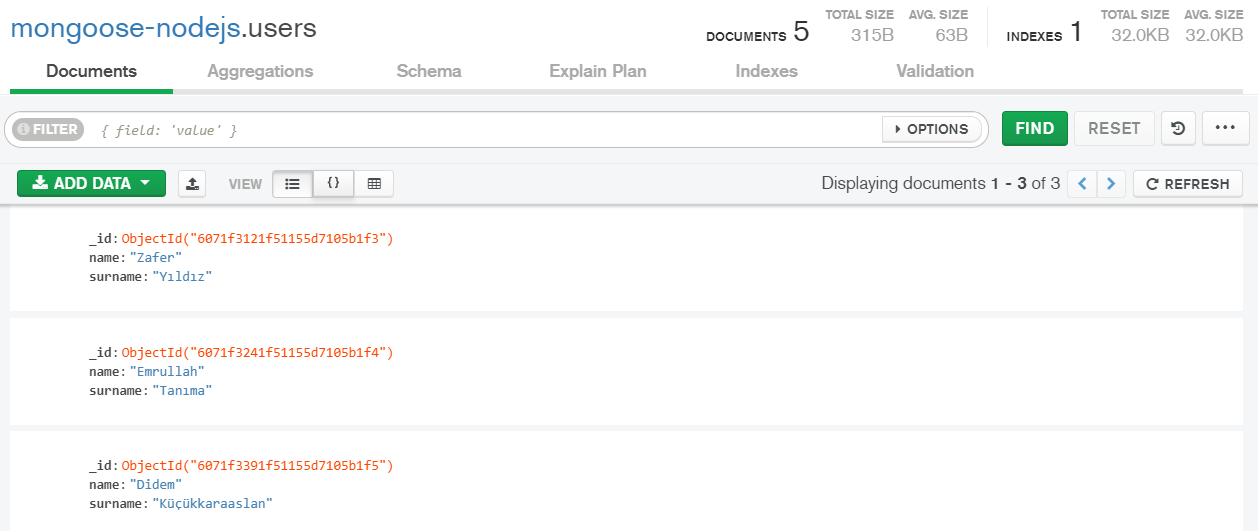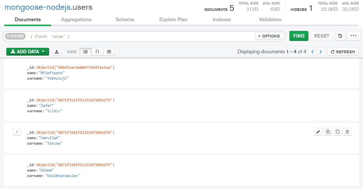 şeklinde olacaktır dostlarım 😊. Şimdi gelelim bir de MongoDB üzerinde buna bakalım gerçekten silinmiş mi ?