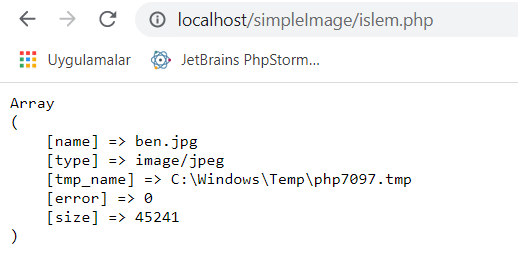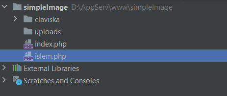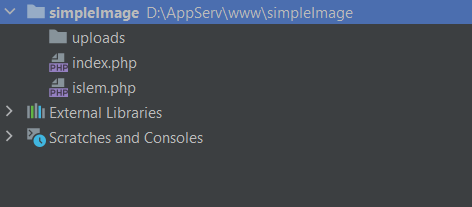 Öncelikle localhost klasörümüzü açıp içerisinde bir klasör oluşturalım dostlarım. İsmine de simpleImage yazalım. Hemen içerisine index.php isminde ve islem.php kısmında iki tane dosya, ek olarak da uploads isminde bir klasör oluşturalım. Yani yapımız aşağıdaki şekildeki gibi olsun