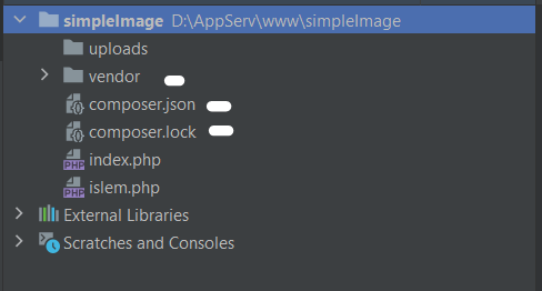 şeklinde bir çıktı bizi karşılayacaktır. Yani bu sonuçlara bakacak olursak dostlarım bizim kodlarımızda bu kısma kadar herhangi bir sıkıntı yok 😊. Bu kısma kadar tamam isek hemen proje ana dizinimize gelip composer ile simpleImage kütüphanesini kurmamız gerekecek. (Bilgisayarınızda composer kurulu değilse dostlarım buradan faydalanabilirsiniz).