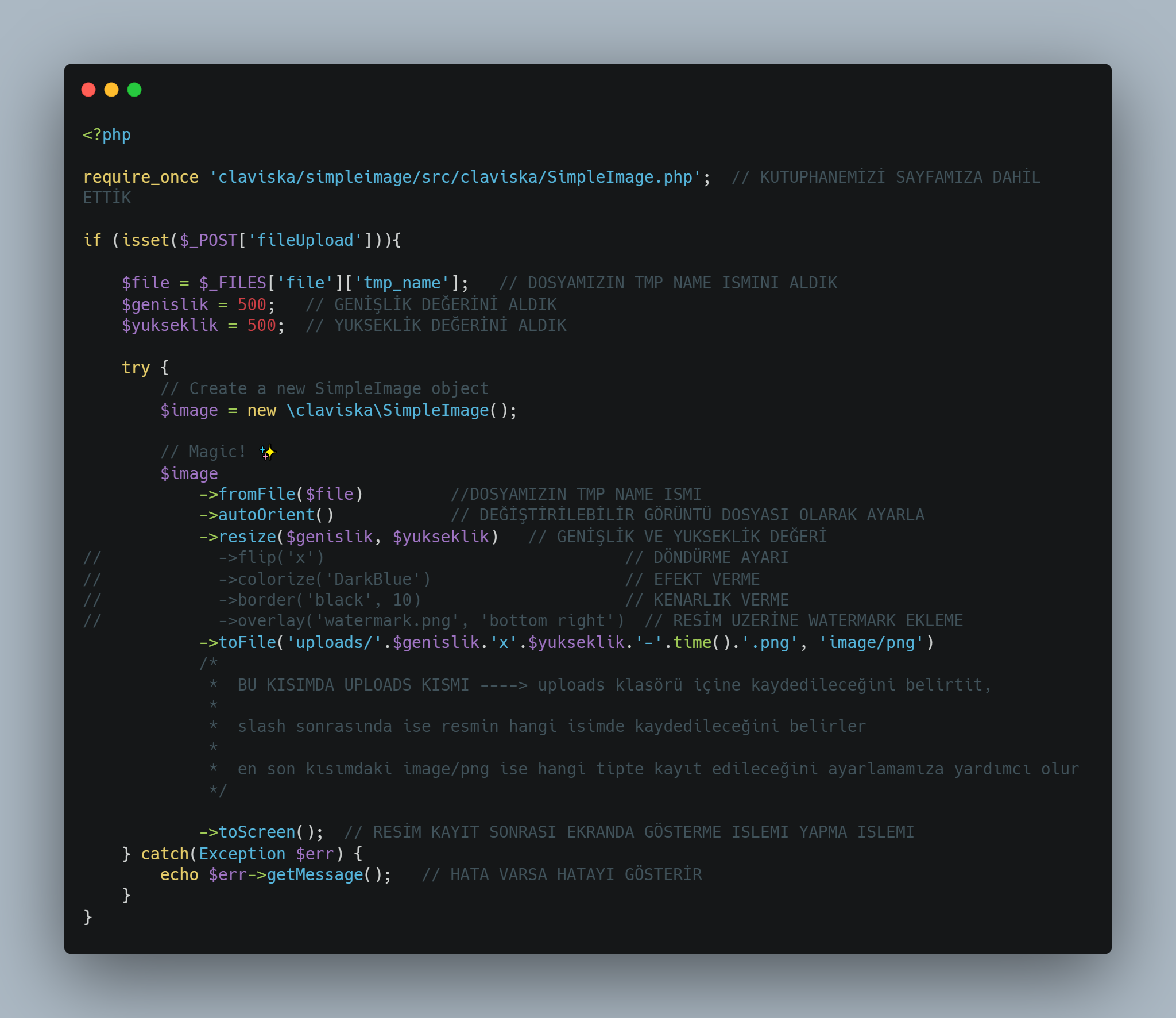 Eveeeet dostlarım bu yazımda sizlere PHP üzerinde SimpleImage kütüphanesinin kullanımından elimden geldiğince dilim döndüğünce bahsetmeye çalıştım. Umarım faydalı olmuşumdur. Eksik veya hatalı bir anlatım yapmış isem benimle iletişime geçmekten çekinmeyin 😊. Konu başlarda biraz karmaşık veya zor olabilir dostlarım anlıyorum. Öğrenme süreci içerisinde bu gibi olayların olması son derece doğaldır dostlarım. Bu süreç içerisinde sizlerden yapmanızı istediğim tek şey her yazımda da dediğim gibi "İstiklarlı ve Azimli Olmanız, Bolca Pratik Yapmanız" olacaktır. Bu dediklerimi hayat felsefeniz yaptığınız sürece başarı sizler için kaçınılmaz olacaktır :).